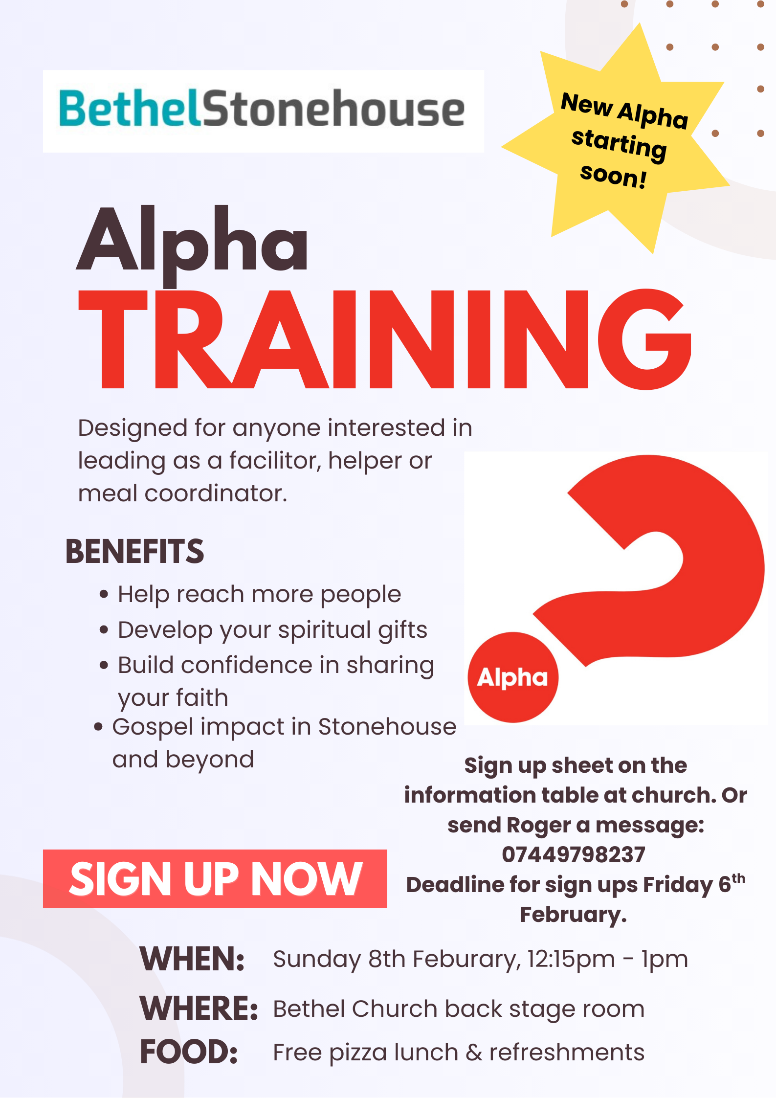 This training session is for anyone who is interested in getting involved. There is no expectation for you to run Alpha but this helps people learn what helping out is all about. Please do send a message to the phone number in the flyer above if you would like to sign up.